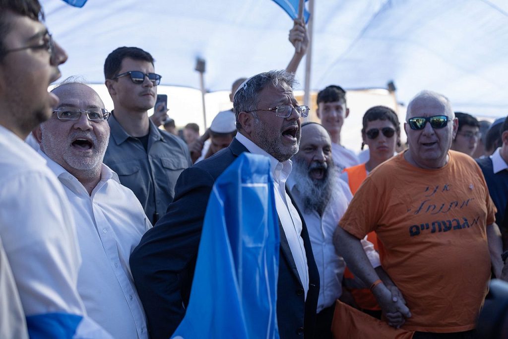 It wasn’t until around 3 p.m., when some attendees had already made their way to the parking lot to leave, that the most high-profile guests began to arrive: Social Equality and Women’s Empowerment Minister May Golan of Likud, followed by National Security Minister Itamar Ben Gvir of Otzma Yehudit, and finally Finance Minister Bezalel Smotrich of the Religious Zionist Party. Ben Gvir danced with some of the attendees before taking the stage. He wished Netanyahu, who was not present, a happy birthday, and then told the crowd that Israel’s “change of conception” since October 7 is bearing fruit.
