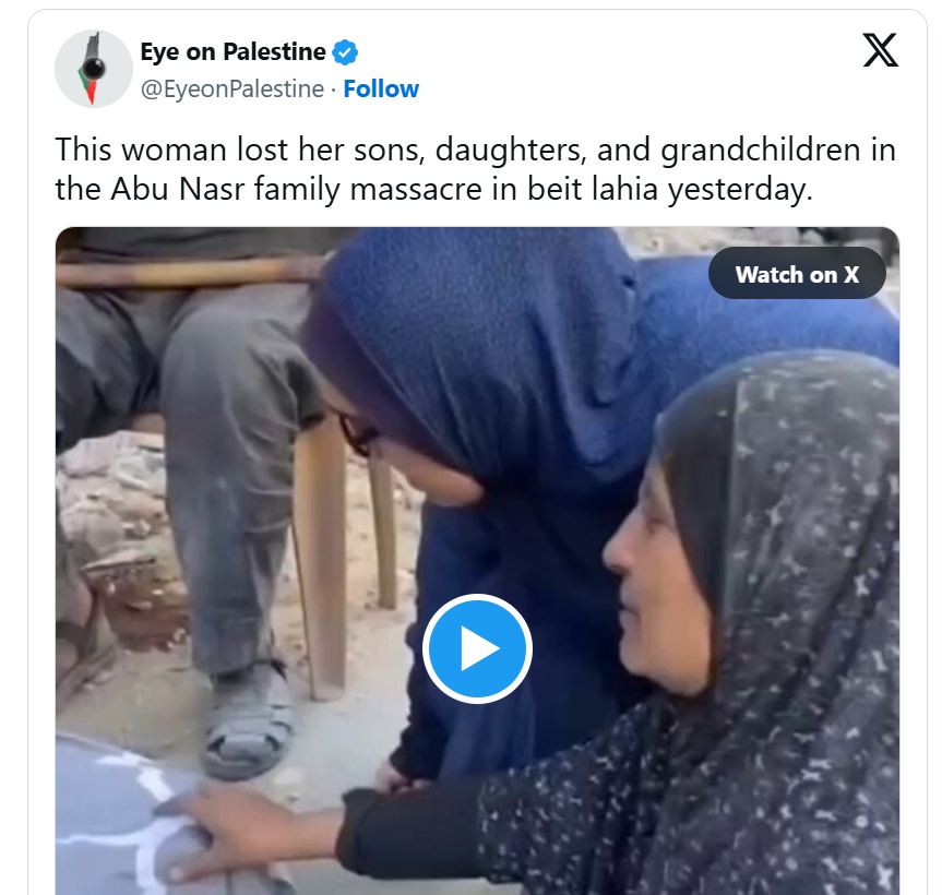 On Tuesday, Israeli warplanes destroyed a five-story building in the town, killing at least 93 Palestinians. A second massacre occurred following Israeli airstrikes on three homes near the Beit Lahia Square in which 16 Palestinians were killed.